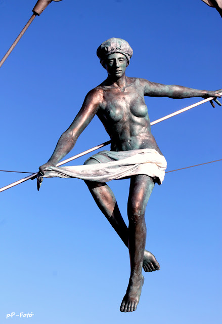 Jerzy Kedziora szobrászművész csodás tornászai lógnak, egyensúlyoznak a híd szerkezetén. A szabadtéri kiállítás címe is erre a lebegő állapotra utal: Between water and the sky. Vagyis Víz és ég között.